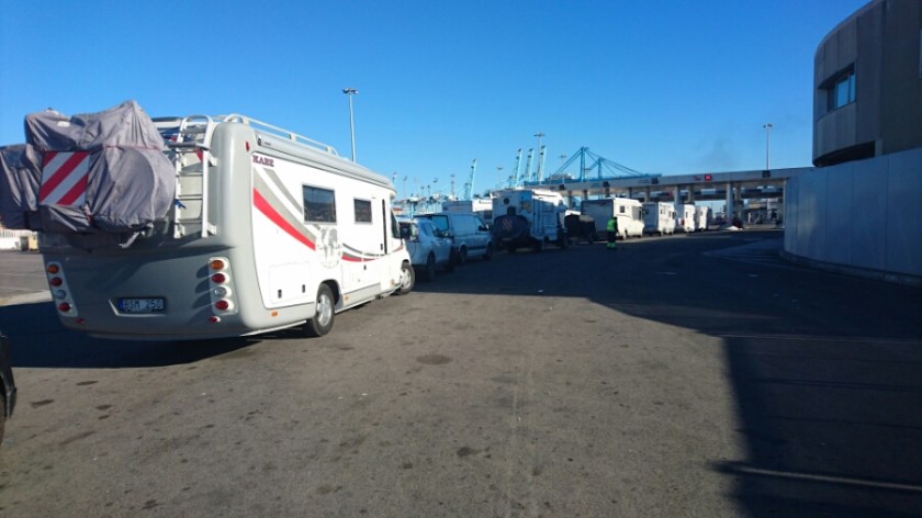 Det var dåligt sortiment på fruset fläskkött, det fanns inget alls så vi köper lite färskt och lägger i frysen. Strax före 10:00 fortsätter vi till Algeciras och färjehamnen. Checkar in och betalar resterande 162€ för tur o retur biljetterna. 18€ betalades som depositionsavgift i går.