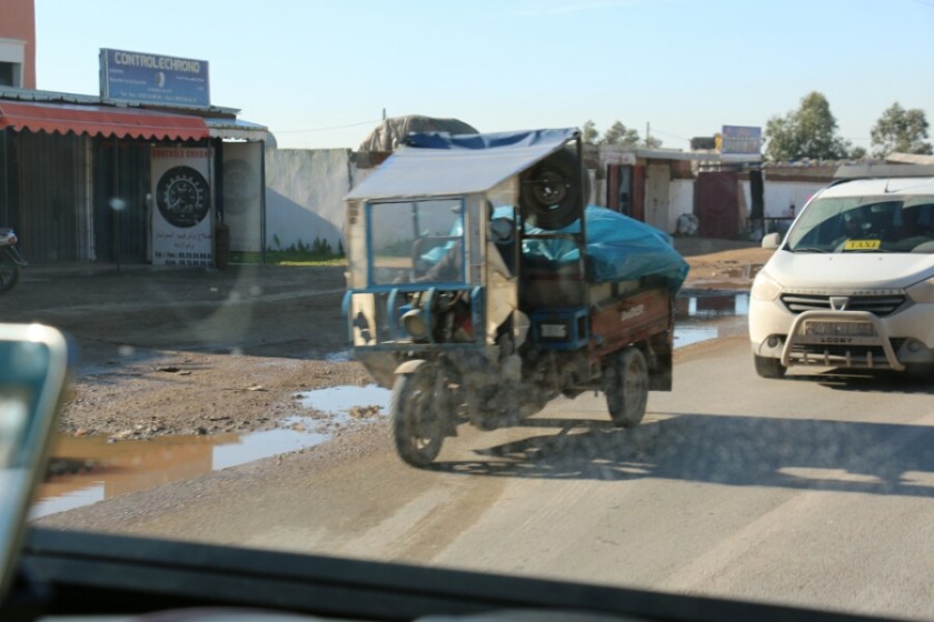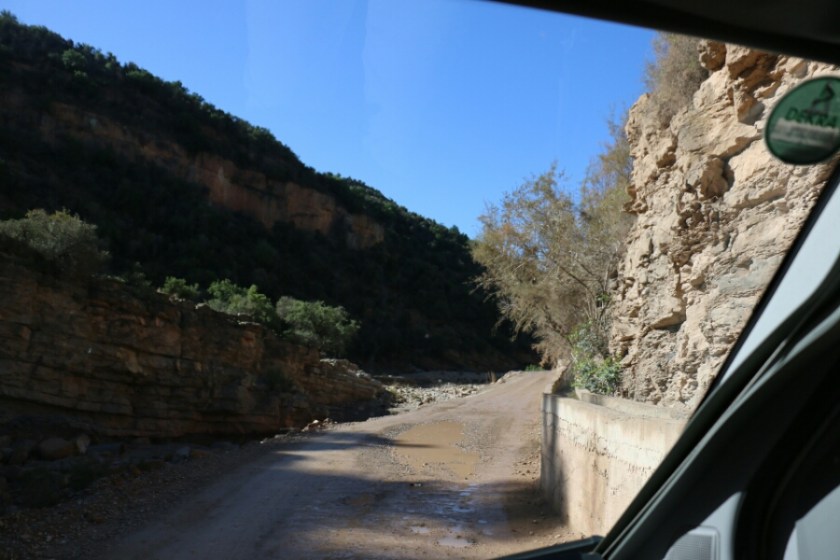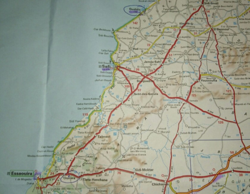 Vi kör kustvägen R301 förbi Safi. Det är grov, ojämn asfalt så hastigheten gick inte över 60 km/tim.