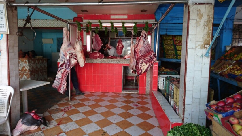 Passerar genom portarna in till Medinan och kommer snart till centrum där det säljs allt från kött, frukt och grönsaker.