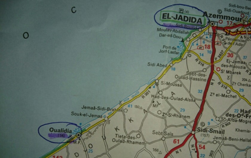 Vi lämnar Camping L’Ocean Blue vid niotiden efter att betalat 270 DH för tre nätter med el. Det har klarat upp och solen skiner då vi kör mot El Jadida.