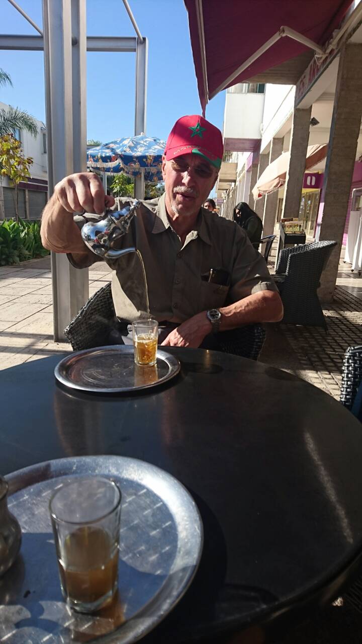 Detta blir sista dagen i Agadir då vi kör söderut i morgon. Promenerar åter in till den arabiska stadsdelen för att bunkra upp med mat i Carrefour affären. Går först till den långa gågatan. De flesta affärerna är stängda på söndag. Vi stannar vid Caf’e Restaurant Arcades och tar varsin te.