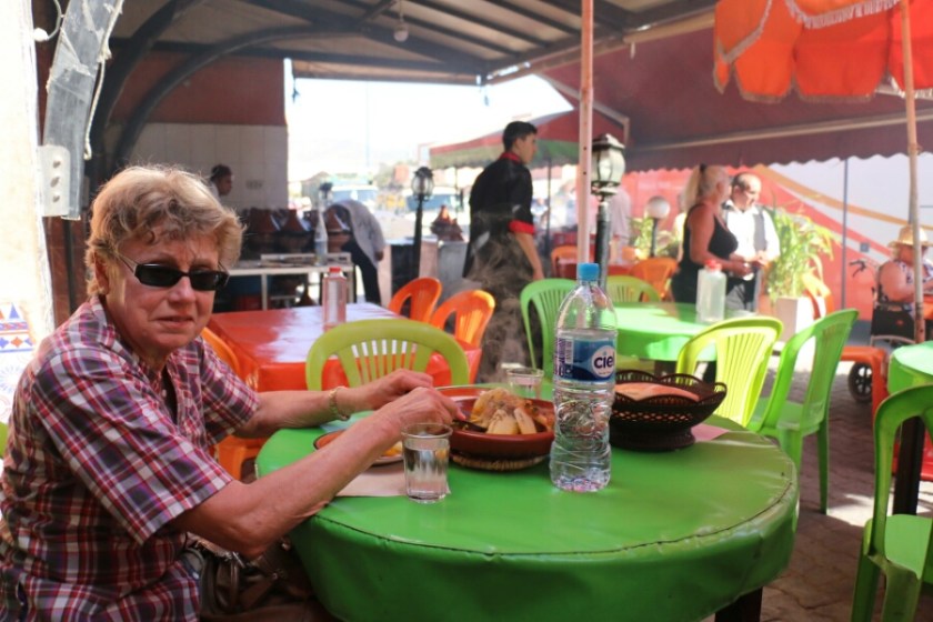 Vi åt lunch på en typ restaurang, pannkakor och te. Efter dryga 2 timmar tar vi taxi tillbaka till campingen. Efter fikat klockan 15:00 går vi till en närbelägen affär som säljer alkohol i källaren över disk. Vi köper 4 flaskor marockanskt vin. Bra service på campingen där man kan få det mesta reparerat på husbilen. Att lackera kantstötta och slitna delar på bilen är populärt och billigt.