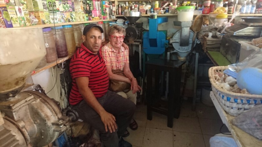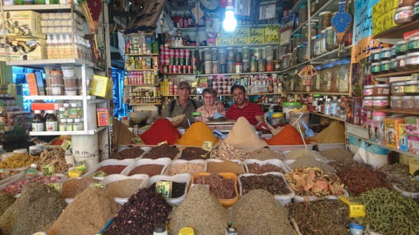 Vi blir bjudna på te. Köper sedan en omgång Marockanskt te, chilipulver och saffran. Allt tyck säljas i denna enorma marknad. Fisk, kyckling, möbler, mattor, kläder och vi ser flera optiker. Ja, det är svårt att beskriva, måste upplevas.