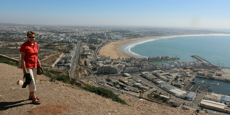 Fantastiskt utsikt över Agadir och strandpromenaden. Många marockaner på besök häruppe i dag tillsammans med försäljaren och kamelförare.