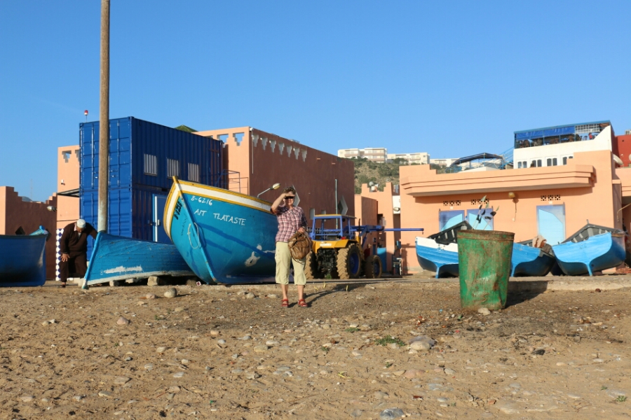 Sol från klarblå himmel i dag också. Vårt nyinköpta simkort från Marocko telekom blev snabbt tömt på gigabyten. Vi tar taxi till Marjane affären där Marocko Telecom har ett kontor och köpte 10 Gig för 100 MD. Promenera sedan mot stranden dit det är c:a 2,5 kilometer. Går genom ett stort område där gator dragits men inga hus byggds ännu.
