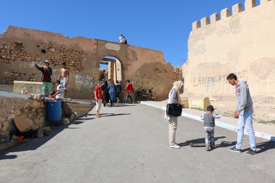 Efter att vi handlat tar vi taxi tillbaka till campingen. Vi tar lite frukt till lunch och tar sedan taxi upp till gamla Kasbah som ligger högst upp på en kulle 236 m.ö.h. Den förstördes av jordbävningen 1960 och bara den restaurerade muren står kvar.
