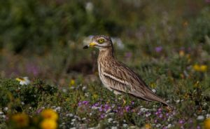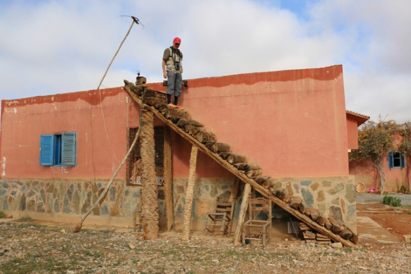 Efter lunch och lite vila går vi genom byn för att fotografera spansk sparv som vi såg i går. Vi grenar över ett fält och så ser vi en marokansk getbonde som fått syn på oss, flaxa med armarna som en fågel och peka utåt ett större fält. Vi följer efter och ganska snart ser vi tjockfot, först tre exemplar och sedan flyger en flock på 6-7 upp.
