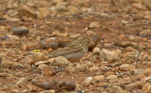 Då vi vänt ser vi en stenökenlärka utanför bilen. Tänkte gå en sväng men det blåste kopiöst så vi gav omedelbart upp. Gör lunch i bilen och kollar på några små ökerråttor som liknar lämmlar och höll till i hål i jorden.
