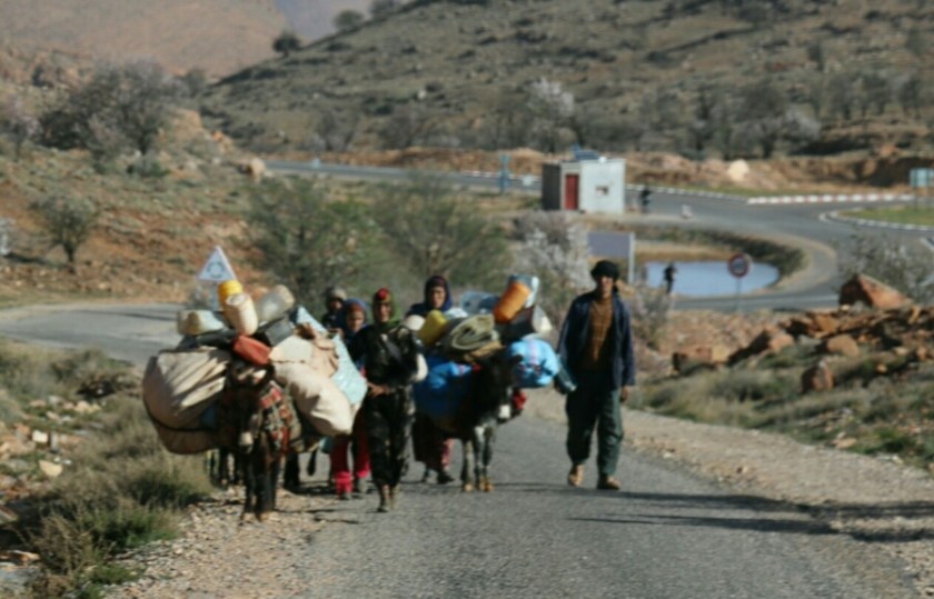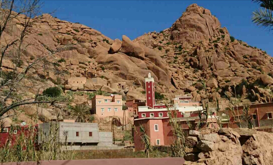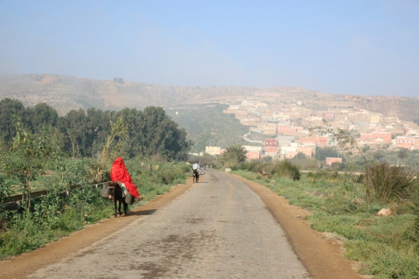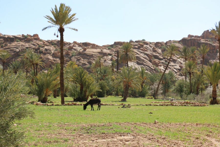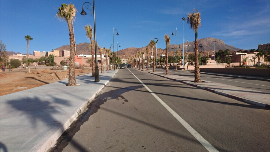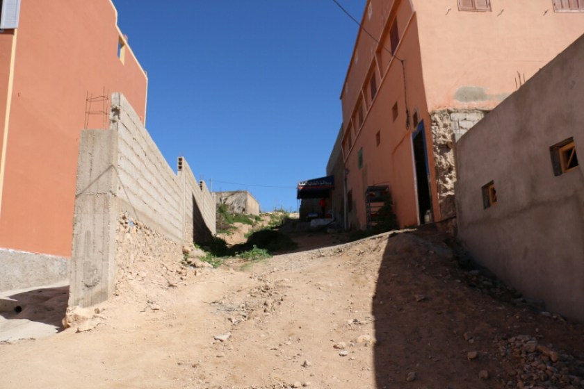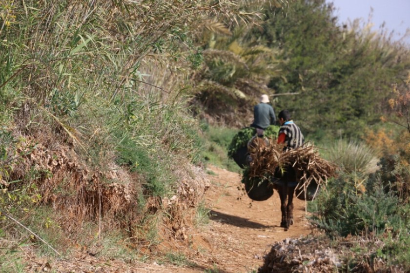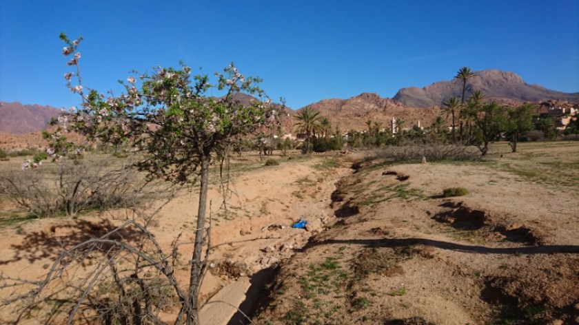 Den är flera kilometer lång. Efter regnet så var det lerigt och mycket kladdigt på sina håll. Vi går genom byn Tighmert ner till den uttorkade floden där en bevattningsränna hade byggds. Vattnet rann på bra där.