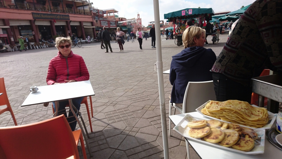 Går till en restaurang med utsikt över torget och tar varsin kanna marockanskt te med pannkaka.