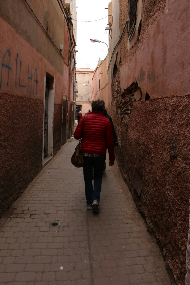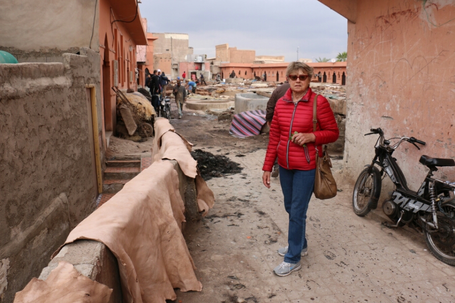 Han sade sig inte vara guide och det skulle inte kosta något. Det blev en lång vandring genom små trånga gator och prång. Till slut var vi framme och då kom en man fram och skulle visa oss skinnberedningen.