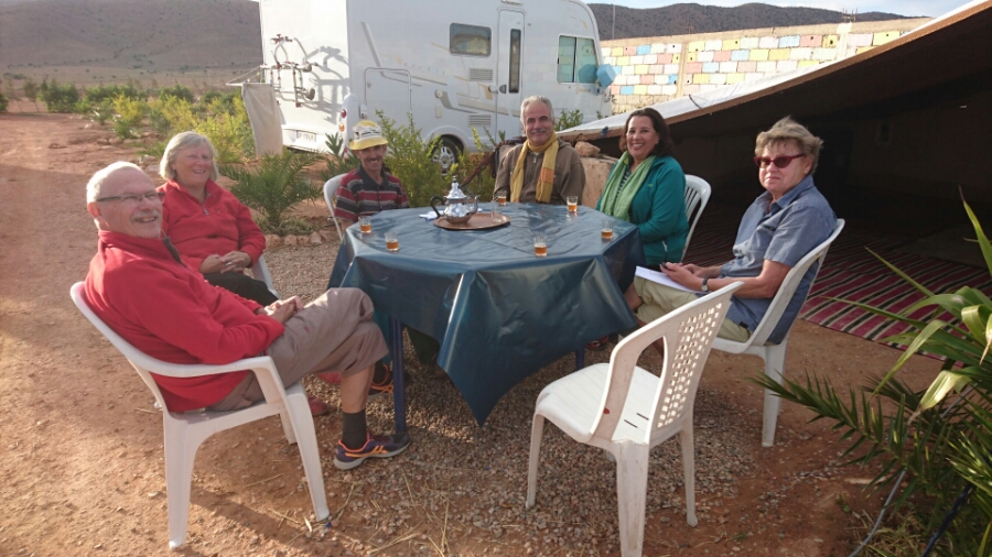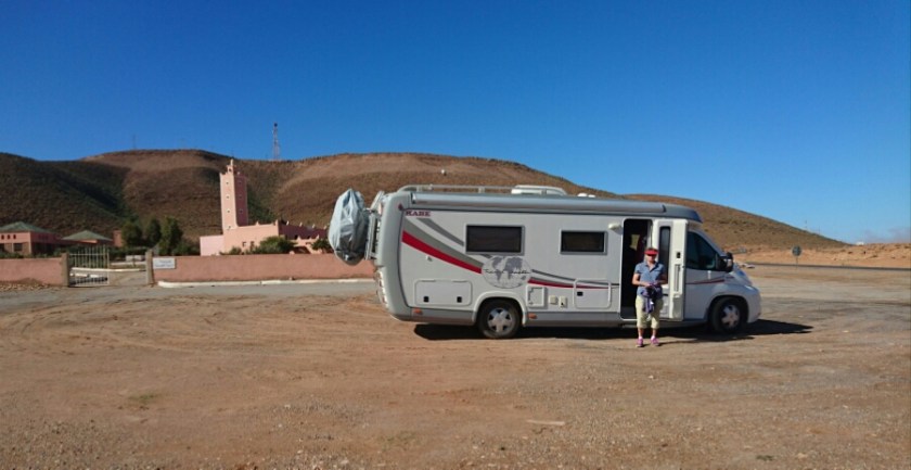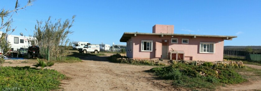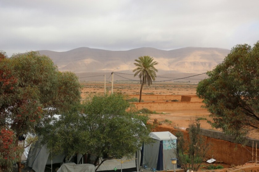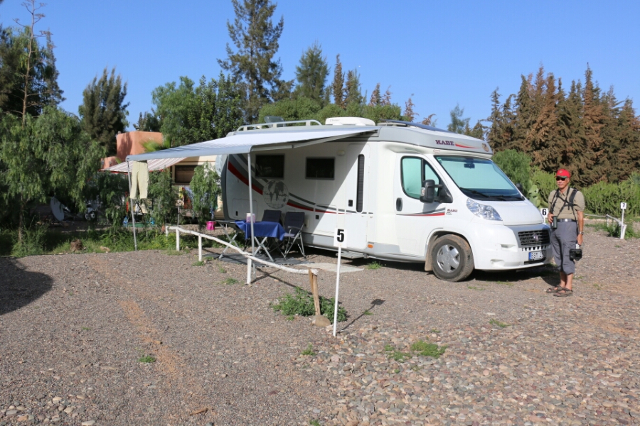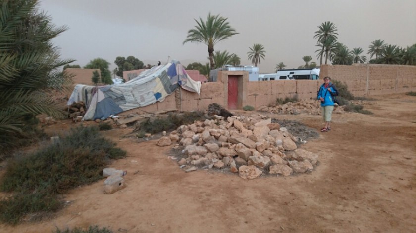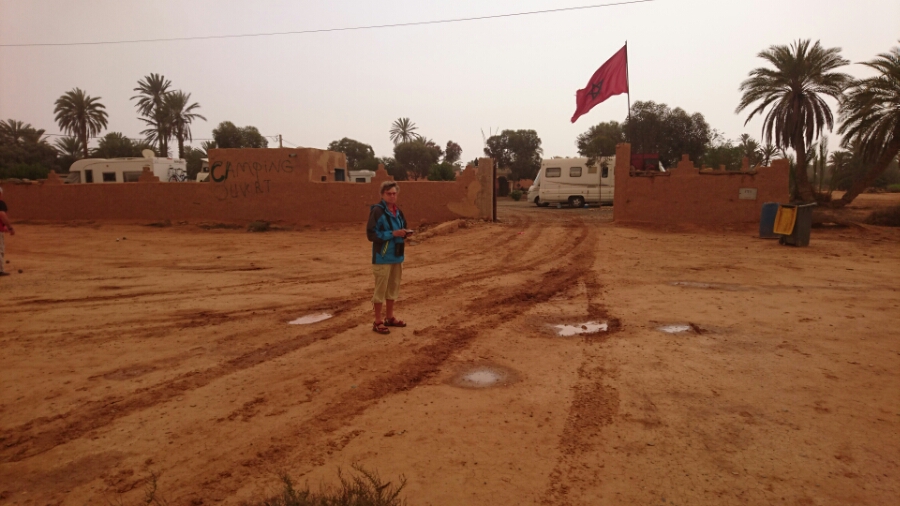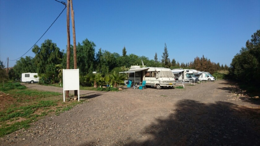 Campingen drivs av en familj och ligger innanför murar av lera som armerats med halm. Omkring 15 bilar får plats här. Hassan tog emot oss och han pratade lite svenska då han vistats i Sverige en tid på 80-talet. Det är uppehåll men disigt och blåser. Innanför murarna dock hyggligt lä.