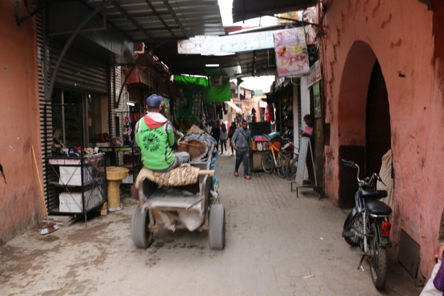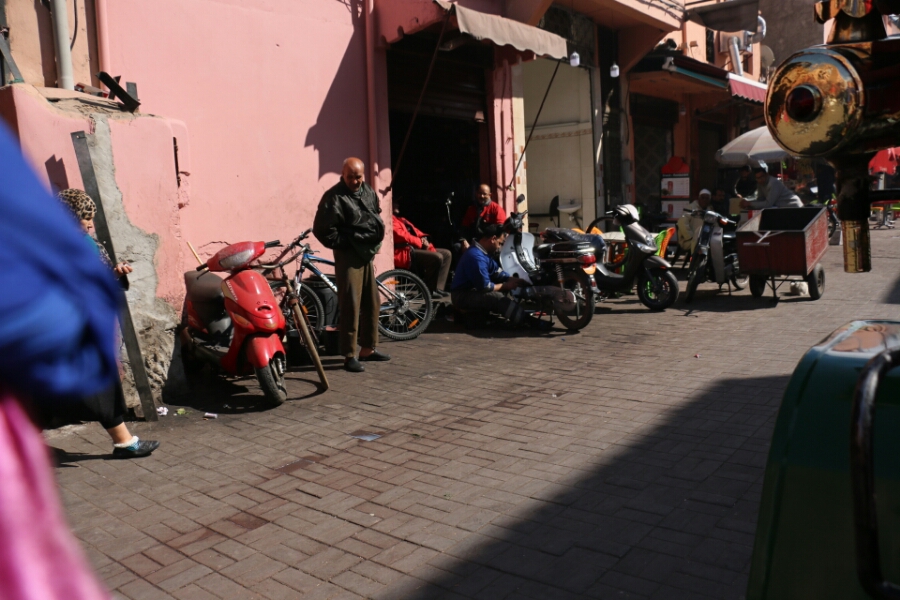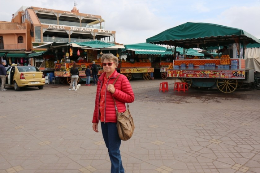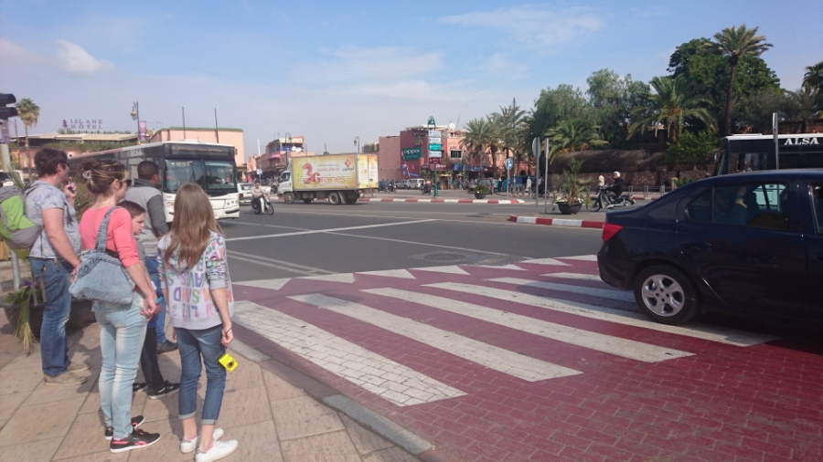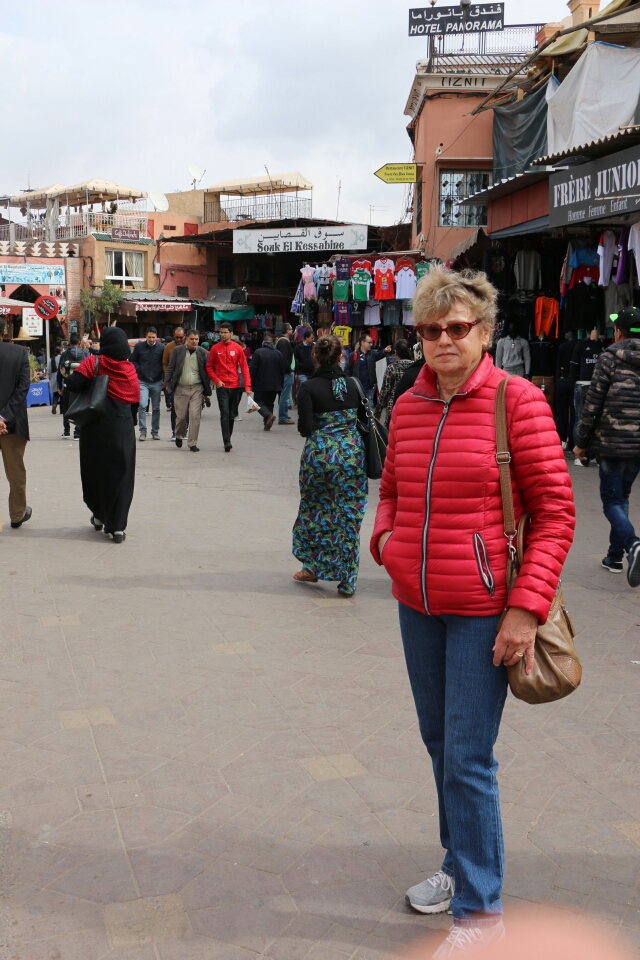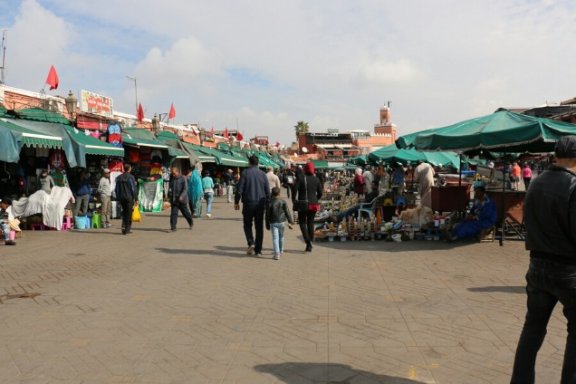 Det är omkring 12 km till Jerma el-Fna som det stora centrala torget utanför soukerna heter. Mycket folk redan på tidig förmiddag.