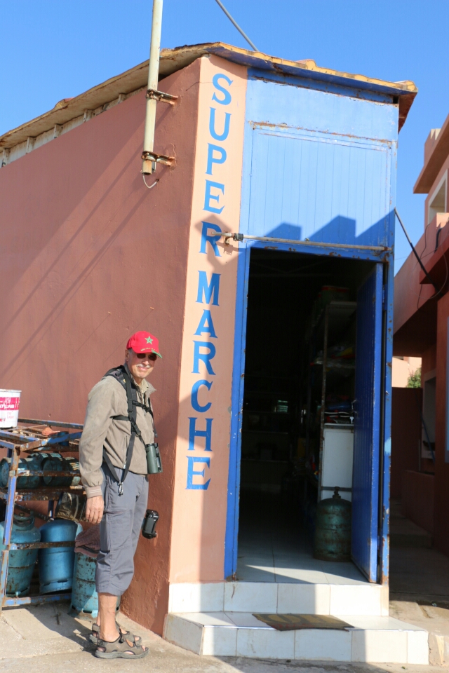 Kör ut på väg N1 söderut mot Tiznit. Den passerar över floden Massa 15 km söderut och vid bron är det en känd fågellokal. Här är vägen 4-filig och vägarbeten pågick vid bron så det var omöjligt att stanna från det håll vi kom ifrån. Bara att fortsätta mot Tiznit där vi stannar vid en knepig supermarcet. Där fanns ingen frukt eller grönsaker. Fortsätter på väg R401 mot Sidi Ifni och stannar i en liten by och äter lunch på en lokal restaurang. Kyckling med pommes fritt på tallrik.
