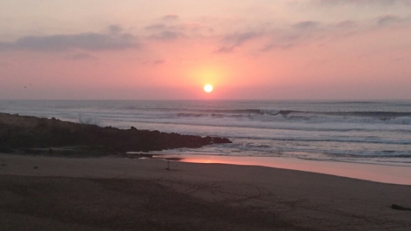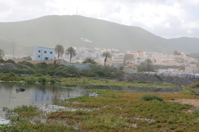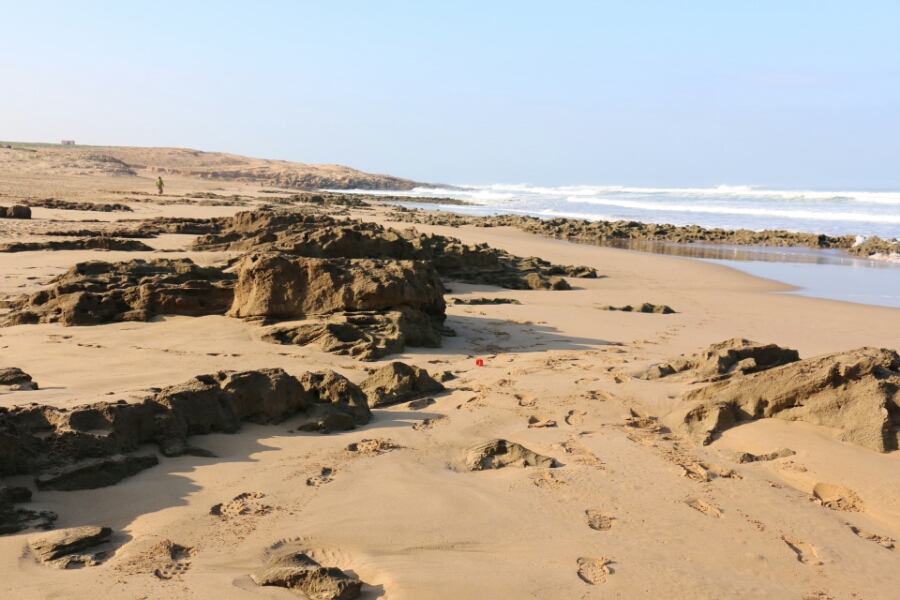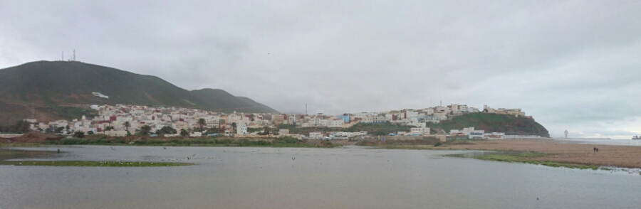 Här i Sidi Ifni blir man väckt vid 6-tiden på morgonen av böneutrop. Sol på morgonen fastän regn aviserats. Vi behövde tvätta men tvättmaskinen fungerade inte. Men det fanns tvättservice då ett par damer åtog sig att tvätta. Förmodligen gjordes det för hand. Dom hängde också upp tvätten till tork. 40MD (36 SEK) betalade vi för det. Går en sväng till stranden och den lilla lagunen strax utanför campingen.