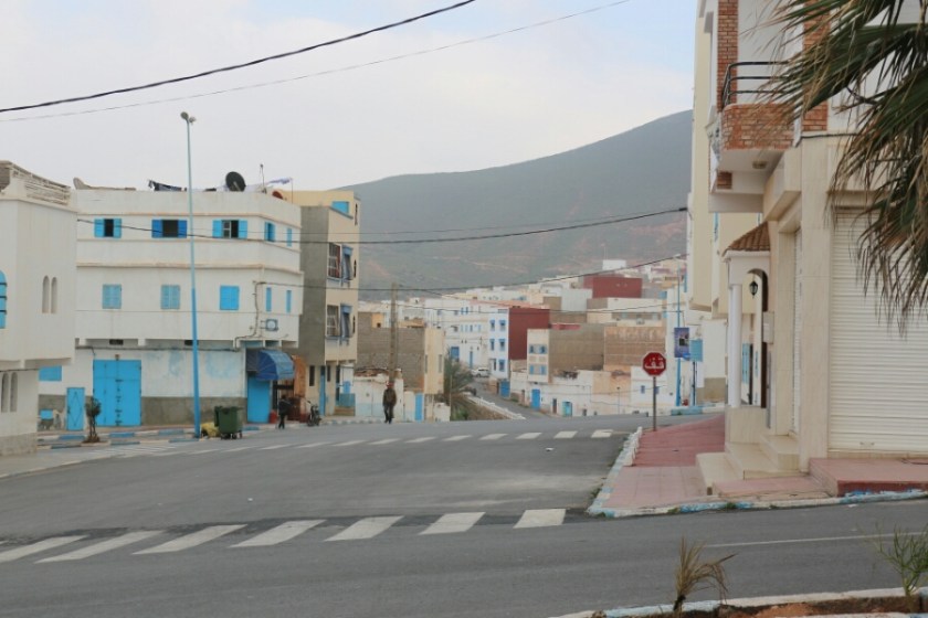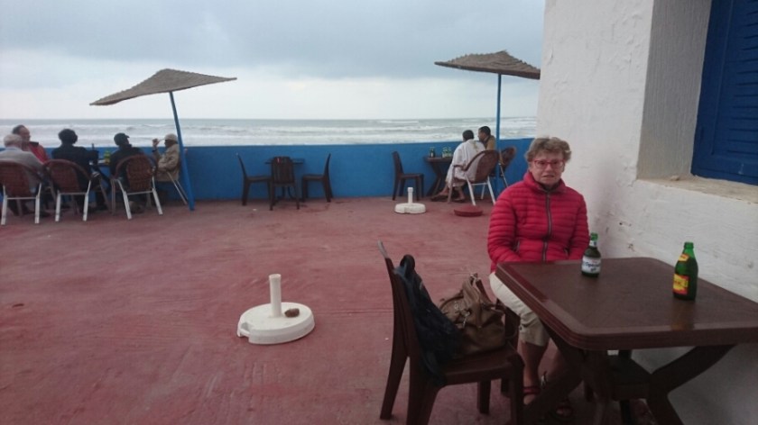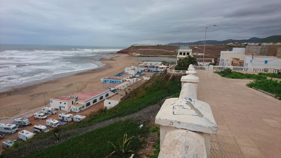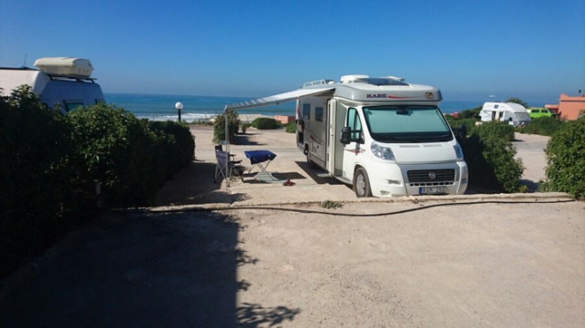 Den låg knepigt till uppför en brant uppförsbacke. Vi skämtade om taxi, som ju inte fanns här. Vår guide ringer ett antal samtal och till slut kom hans onkel och kör oss tillbaka till husbilen i en skramlig bil. 30MD betalade vi för resan. Fortsätter sedan till Sidi Wassay och campingen som ligger intill stranden.