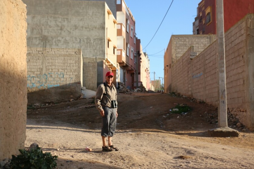 Vi lämnar campingen Oasis de Tighmert vid niotiden. Betalade 140 MD för två nätter med el. Vi gav också Hassan och hans fru ett par små presenter eftersom vi fick stekt fisk av dom. Kör nu förbi väg N1 söderut c:a 35 km söder om Guelmim. Där skall det vara bra fågelskådning på de sandiga slätterna. Vägen är bra men smal så det går inte att stanna var som helst. Vi hittar en plats utanför ett större hus.