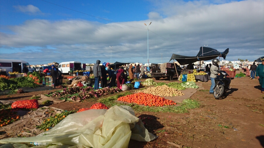 Först kör vi till den stora marknaden i Sidi Ifni som ligger på den gamla nedlagda flygplatsen. Kraftig blåst förstör lite av upplevelsen. Många säljer frukt och grönsaker. Höns och kalkoner slaktades på plats. Vi köpte äpplen och apelsiner. Fortsätter sedan på väg N12 mot Guelmim över ett bergigt landskap och på dålig asfalt. I Guelmim tar vi en mindre väg mot Fort Bou Jerif. Det är då omkring 30 km kvar och de sista 9 kilometerna går på grusväg. Då vi tar av in på de sista 9 kilometerna så är det ingen egentlig väg utan ett uppkört spår över en stenöken. Vi kör sakta en kilometer och vänder. Spår och stenar gör att vår bil lätt tar i under.