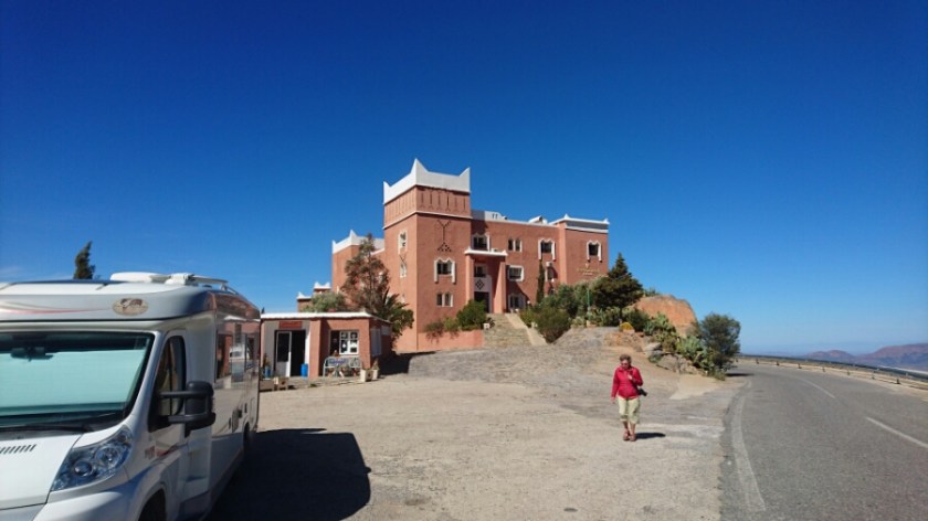 Där låg ett hotell med fantastisk utsikt. Stannar sedan i en trång dal där vi äter lunch i solskenet utanför bilen.