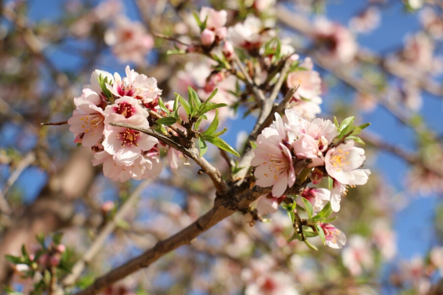 Vi går en kort promenad i dalen där det vaxer enstaka mandelträd som nu blommar.