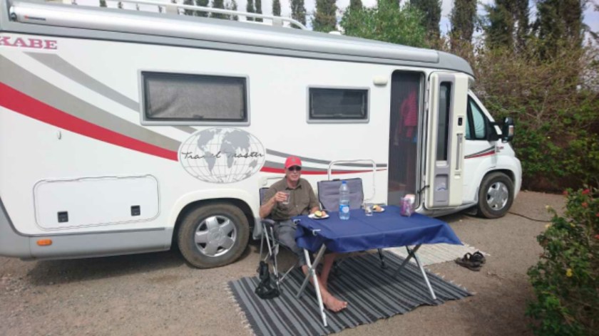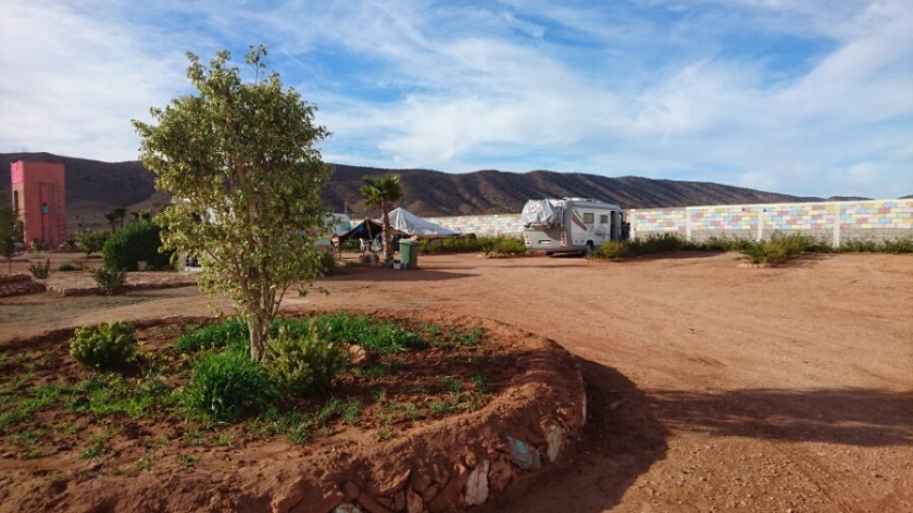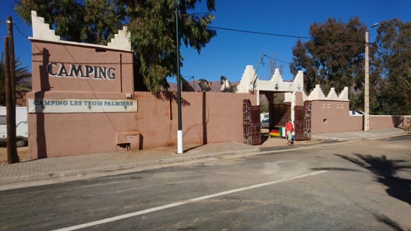 Vi stannar vid Camping les 3 palmiers i Tafraoute vid 15-tiden. En trång camping innanför murar som var i stort fullsatt.