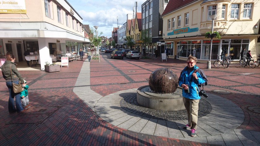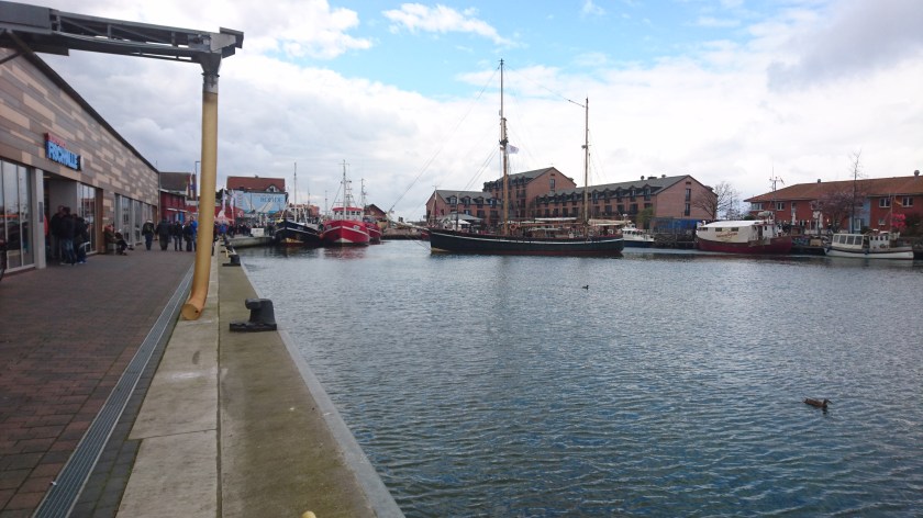 Promenerar sedan efter strandpromenaden till Heiligenhafen centrum invid hamnen. Mycket folk är i farten trots det kyliga vädret.