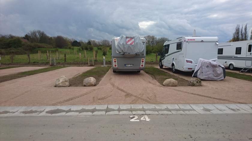 Där var en helt ny ställplats uppbyggd. Det var mycket smala platser och lerigt gräs emellan. Man betalar i en automat och får ut ett kort som är laddat med 5€ för el och vatten. Betalade 30:40€ för en natt inklusive turistskatt och Wifi.