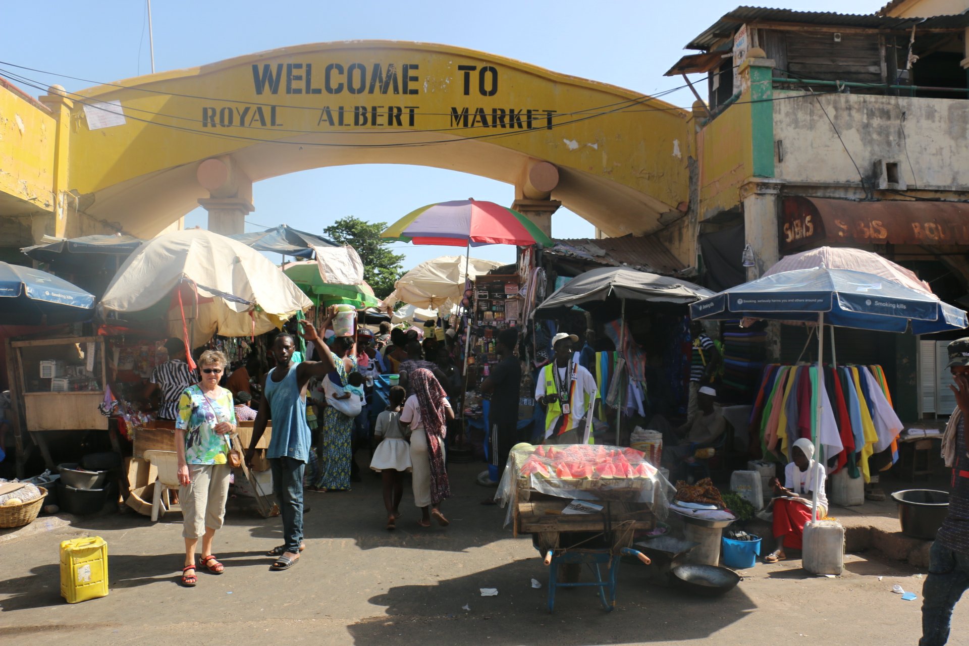Det är fortfarande problem med luftkonditionering som inte fungerar. Enligt uppgift håller man på och reparerar en trasig generator och det skall bli klart under dagen. Efter frukost tar vi en taxi in till huvudstaden Banjol. 1000 dalsari (200 SEK) kostar turen och då väntar taxi chauffören på oss. Det visar sig att han blev vår guide också. Vi stannar utanför ingången till den berömda marknaden, Royal Albert Market.