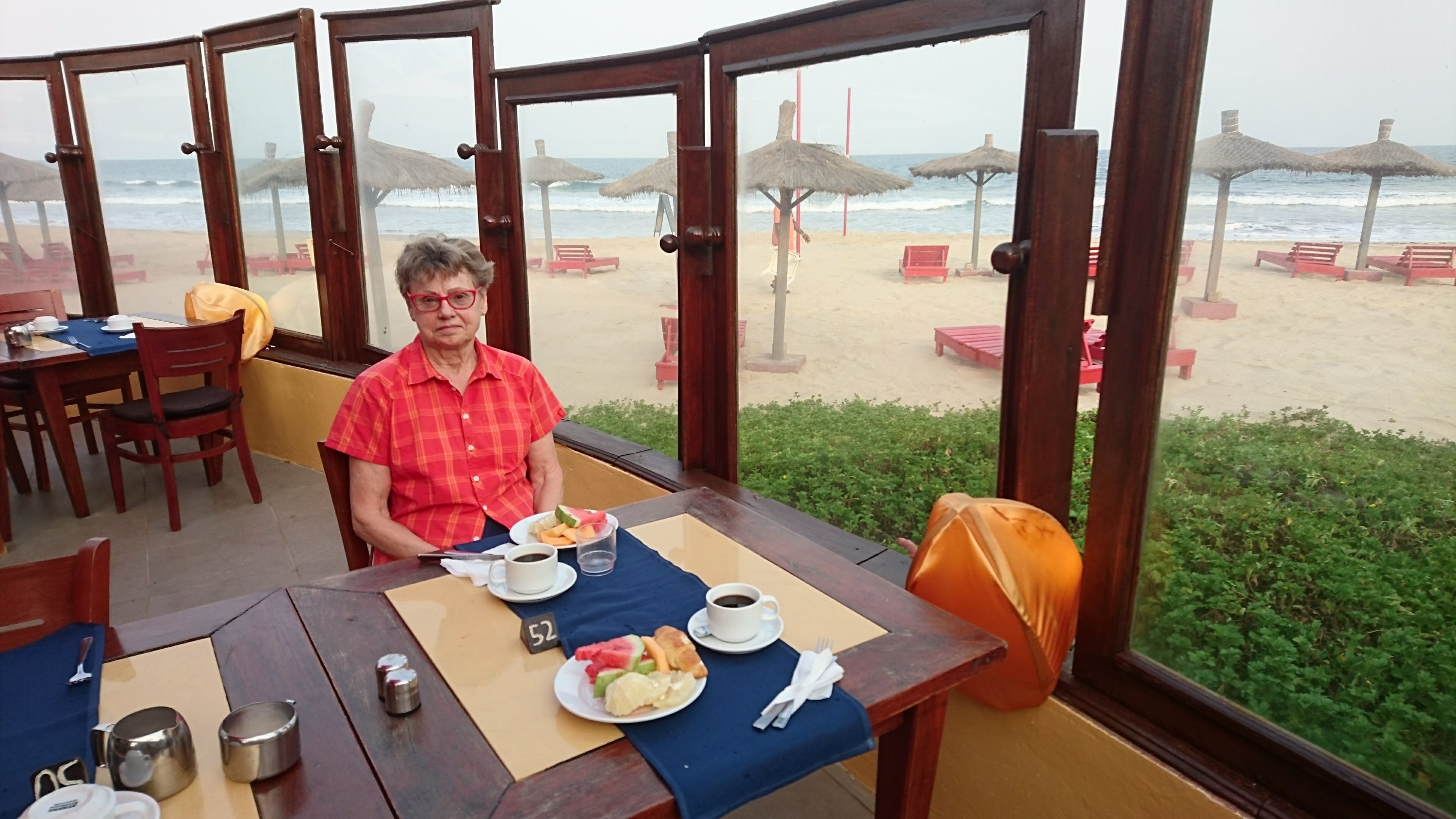 Det ljusnar vid sjutiden. Vi drar oss och äter sedan frukost. Sitter vid ett bord intill stranden.