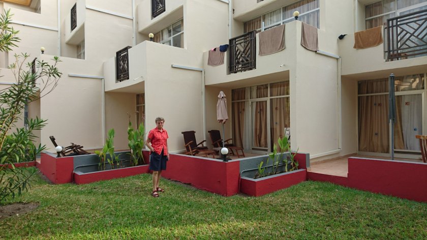 Det var mycket varmt då vi gick ur planet och till bussen på landningsbanan. Det gick smidigt genom passkontrollen och väskorna kom snabbt. Anslutningsbussen avgick ganska snart. Det var dryga 25 kilometer till Kombo Beach Hotell.