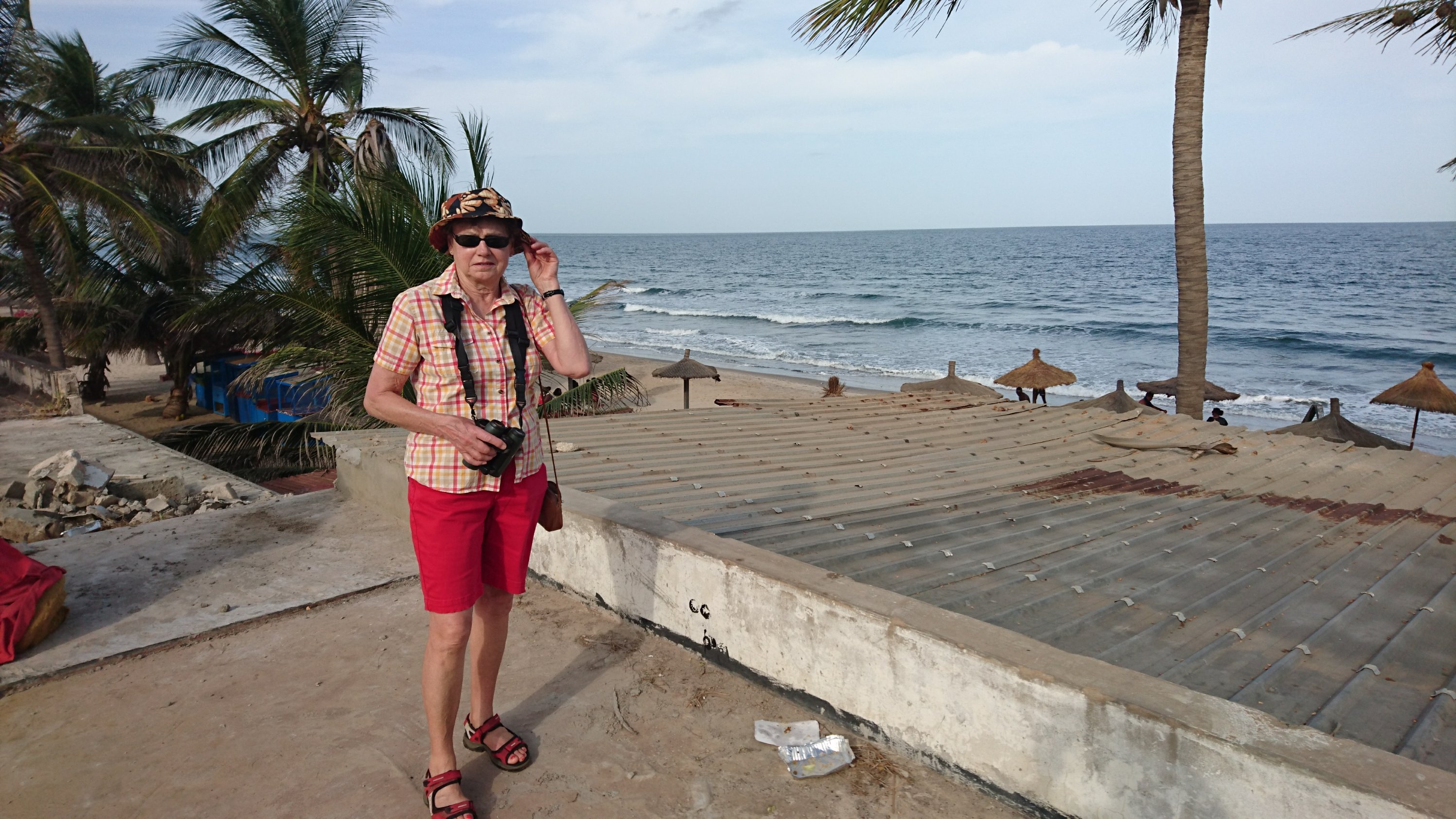 I dag går vi en promenad före frukost. Klockan 07:15 går vi vänster ut från hotellet och följer vägen och gångbanan ut till Atlantic Road förbi infarten till golfbanan och en bit norrut innan vi går ner mot stranden och tar den tillbaka. 3,5 kilometer på 62 minuter blev det. Efter frukosten går vi och köper frukt. Vid 13-tiden blev det solstolarna som vanlig och 16:00 promenerar vi ner till bron över Kotu floden igen. Ganska lugnt men plötsligt hörs en gyllingsångare och den visar snabbt upp sig. Lite senare då vi skall återvända kom en nordlig krombek och satt fint på en gren några sekunder. Liten fågel med extremt kort stjärt. Vi tänker åka till Senegambia och äta middag så vi tar en taxi som vi kom överens om i går. C-boy kör oss och vill ha 500 dalasi för tur o retur och han väntar i två timmar. Han släpper av oss vid en hygglig restaurang, Restaurang African Queen, och vi äter en bra middag. Går sedan till det hotellet som vi hade information på dagen efter vi kom hit och hämtade ut lite dalasi. Jag ringer taxichauffören på det nummer som står på kortet vi fick av honom. Men inget svar, bara en telefonsvarare. Vi väntar en dryg halvtimma utanför restaurangen men ingen bil kom så vi tar en annan taxi tillbaka. 300 dalsari kostade turen.