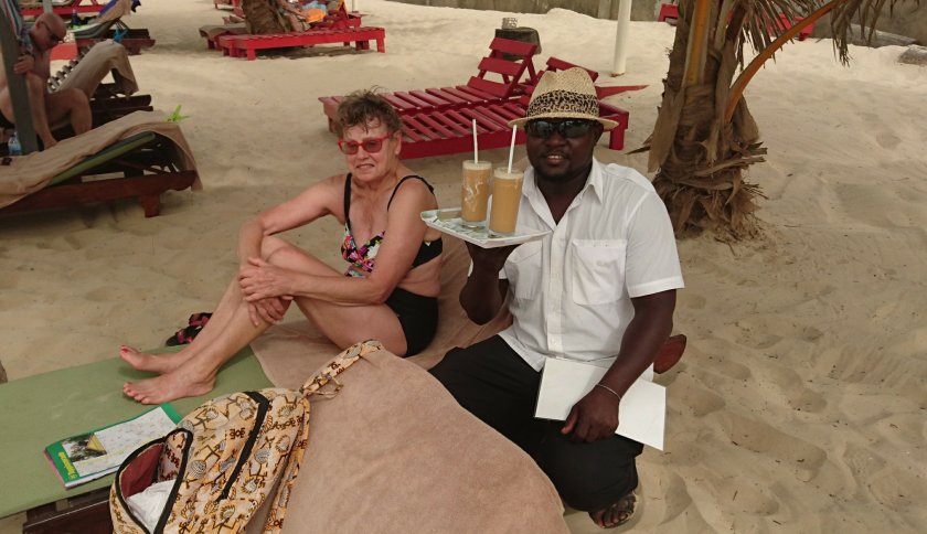 I dag tar vi det väldigt lugnt. Efter frukosten vila på rummet, kollar lite runt fågelmatningen och sedan fruktlunch på altanen. Klockan 13:00 är vi på solstolarna igen. Promenarade efter stranden söderut över Kotu floden och bort till udden. Det blev 2 kilometer fram och tillbaka. 16:30 ger vi oss och klockan 19:00 skall vi träffa Ebou och diskutera en dagstur till Senegal som vi talat med honom lite löst om tidigare. Jodå det var inga problem med att ordna en tur till nationalparken Fathala i Senegal där man kan se några av Afrikas större däggdjur och ett antal fåglar. Han vill ha 550€ för två personer och allt betalt. Vi tyckte det lät väl dyrt men tänkte acceptera ändå. Behöver hämta ut mera pengar så Ebou erbjöd sig att skjutsa oss till Senegambia där vi tagit ut pengar på VISA kortet tidigare. Han erbjöd sig också att vänta medan vi åt middag på en restaurang där. Vi tog närmaste restaurangen och åt en fin fiskmiddag. Vi började fundera på om det inte var på tok för dyrt med 550€ för en dags utflykt och beslutar oss för att avboka resan. På hemfärden avbokade vi på grund av den höga kostnaden. Ebou blev fundersam och frågar vad vi vill betala. 250€ sade Birgitta och efter en stund sade Ebou att han kan göra resan till Senegal för 300€ eftersom han inte hade något annat inbokat just nu. OK, så vi accepterar och betalar honom 300€ i förskott och han skall hämta oss måndag 20/11 klockan 06:30. Så det blir spännande att se hur det kommer att fungera.