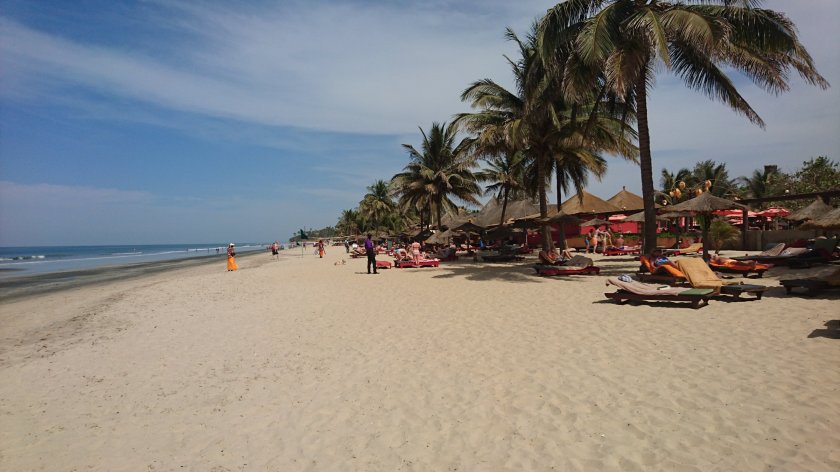 Vi går en promenad på morgonen innan frukost. Går mot norr och förbi infarten till Fajara Golfklubb. Som vanligt är det flera s.k. guider utanför golfklubben som vill guida runt oss. Vi sade nej vänligt men bestämt. Fortsätter en bit på Ocean Road och går ner till stranden som vi följer söderut till vårt hotell där vi direkt går till frukostbordet. 3,4 km blev promenaden på 63 minuter. Efter frukosten blev det lite surf på internet vid receptionen på dess tröga wifi. Frukt lunch på terrassen som vanligt innan vi går till stranden vid 13-tiden. Köpte varsin Baobao/apelsin juice av Ali Baba för 300 dalasi som vi gjort de senaste dagarna. Det går bra att bada i havet då det är ebb annars är det ganska höga vågor. Vid 16-tiden knallar vi ner till Kotu Bridge igen för att kolla efter gråsparv som skall hålla till runt en vattenkran. Det var mycket folk som sprang och tog vatten ideligen så vi såg inga gråsparvar. En fågelguide som tjatat på oss varje gång vi varit till bron frågade oss hur resan till Gorgetown varit. Bra sade vi men vi missade den vitryggiga natthägern. Oj sade han, den finns ju här bara 30 minuters bilfärd bort. Han kunde arrangera bilresa dit och båt för att se den, 100% garanti och pengarna tillbaka om vi inte såg natthägern. Han vill ha 60€ för allt, vi bjöd 50€ som accepterades. Vi bestämde att åka som i morgon, lördag klockan 08:00, så vi betalade 50€ i förskott. Det blev middag på restaurang Boss Lady igen. Vi åt den lokala chicken Yazza och kostade på oss en flaska vitt från Sydafrika för 500 dalasi. (100 SEK).