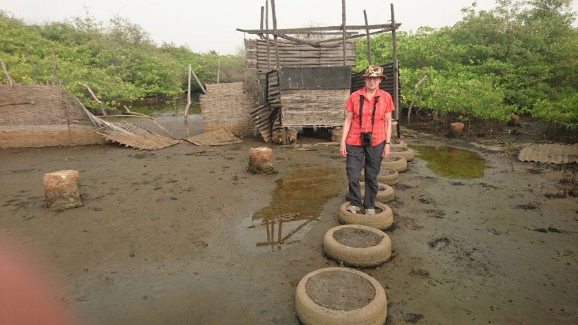 Efter frukost 07:30 går vi en kort sväng ner till Kotu Bridge. Stöter genast på en guide som kan visa oss rallbeckasin. Han accepterar 10€ efter att först begärt 20€ för guidningen som sker till fots från bron i kväll 16;00. Vi upptäckte ett gömsle söder om bron där några vitkronad snårskvätta höll till i dunkelt under mangroven. Efter en timma och 2 kilometers promenad återvände vi till rummet och tar det lugnt på altanen. Efter den vanliga fruktlunchen intar vi solstolarna.
