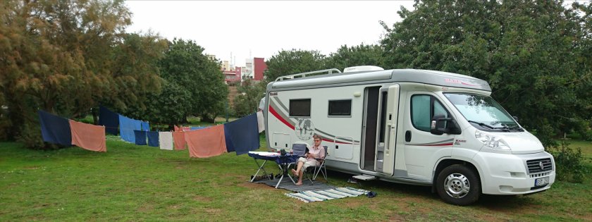 Sedan taxi tillbaka till campingen igen. Vi betalade också för tre nätter med el 345 MAD (310 SEK) då vi skall åka tidig i morgon bitti till verkstaden för service på bilen. Det mulnade och började blåsa och regna så resten av dagen blev vi i bilen.