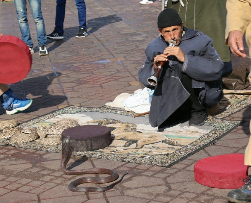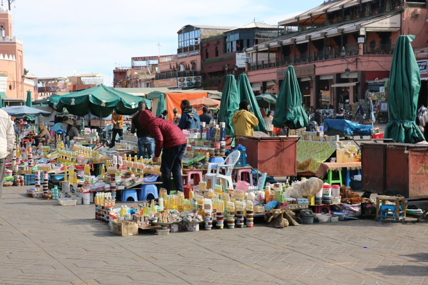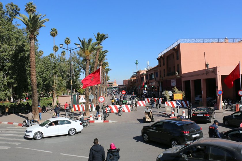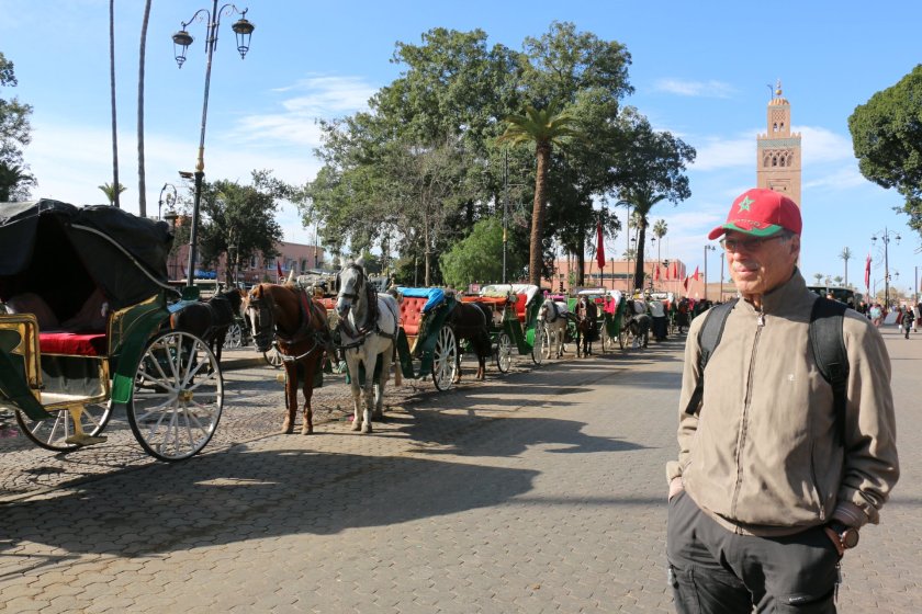 Solig morgon efter en kylig natt. I dag tar vi oss in till centrala Marrakech med taxi från campingen är det c:a 15 kilometer. 100 MAD (90 SEK) kostar färden in till Jemaa el-Fna, det stora turisttorget. Vi var ju här förra året också så vi känner igen oss.