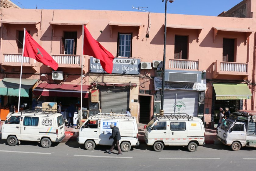 En knapp timma tog promenaden fram och tillbaka. Vi beslöt att åka in till centrum i dag också och dela taxi med andra campare. Taxin tar ju 6 personer enligt information i receptionen. 11:30 går en taxi som vi tror skall fungera men 4 fransmän var inte intresserade att ta med oss i bilen så vi fick ta en egen taxi för 100 MAD igen.