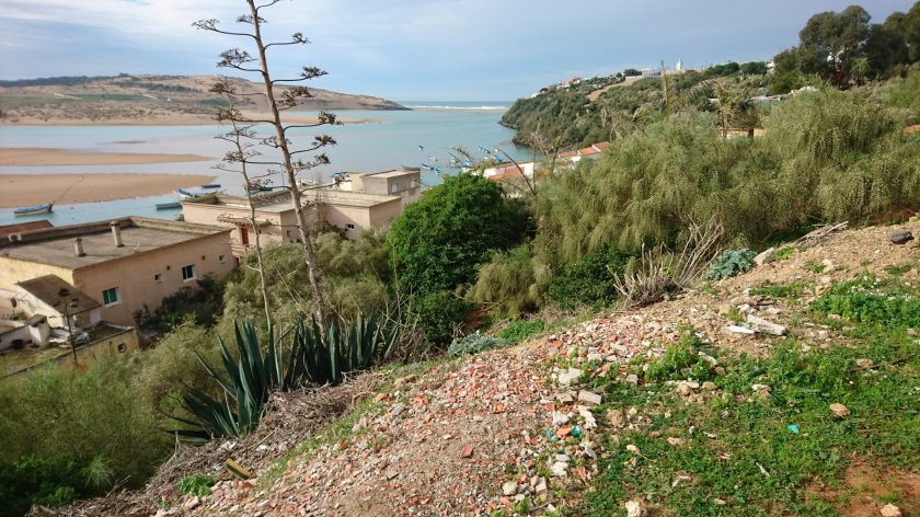 Kylig och mulen morgon. Vid 09:30 tiden promenerade vi de branta trapporna upp till centrala staden. På vägen upp är det fin utsikt över lagunen Merja Zerga.