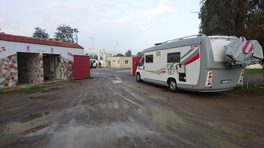 Återvänder och checkar in på campingen som har 100 ganska trånga platser.