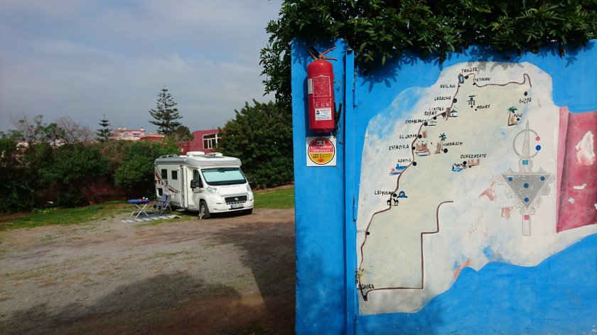 Vi lämnar Camping La Chenaie i Kenitra vid 09:00 efter att betalat 60 MAD för en natt med el.