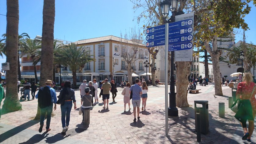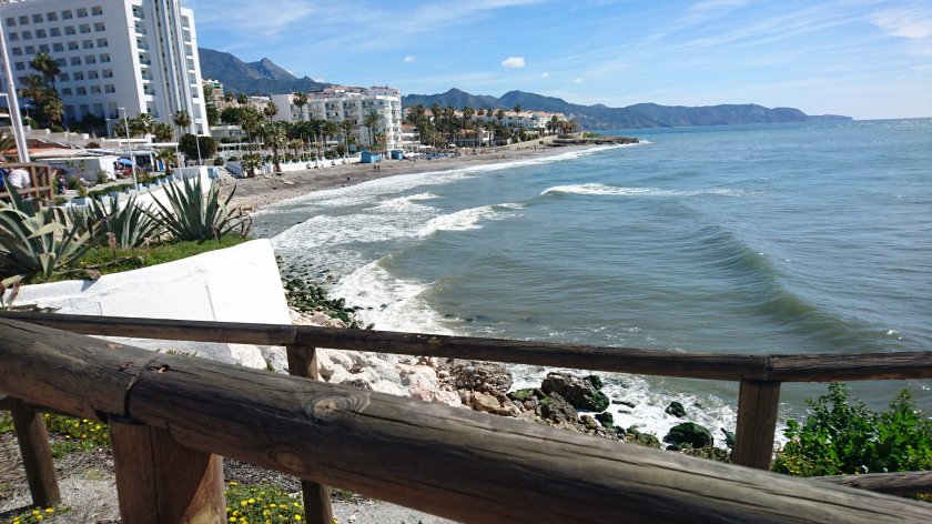 Vi hittar en bra plats. Flera svenska bilar intill och någon har stått här sedan november. Efter lunch tar vi en promenad ner efter stranden till Nerja. Vi går till den breda bäcken och sedan hem igen efter huvudvägen.