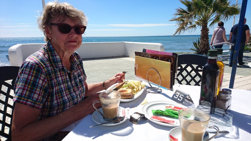 Det blåser ganska friskt men en restaurang ligger i lä så vi stannar där och tar varsin kaffe med toast.