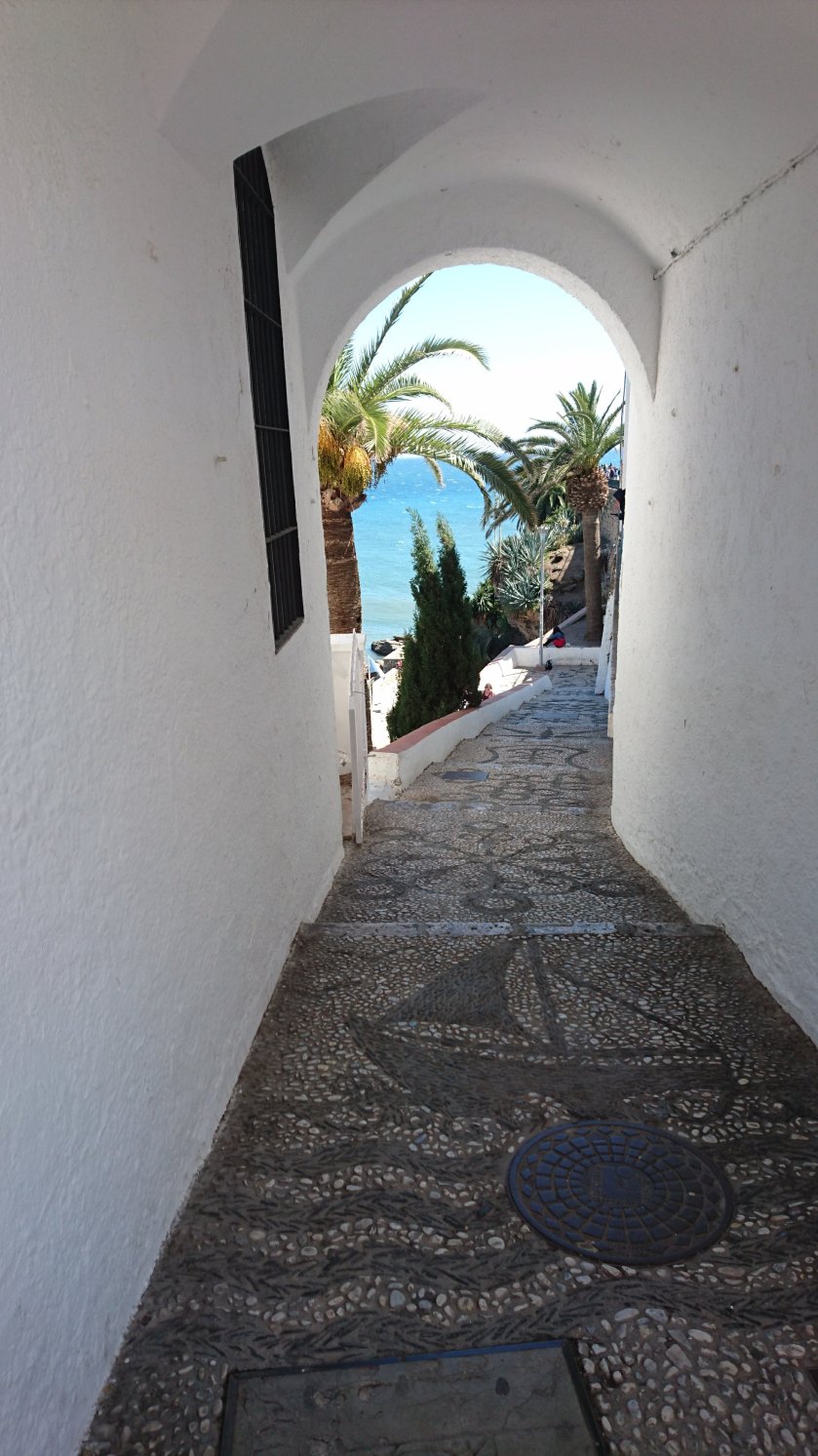 2018-03-31 Lördag PåskaftonI dag skall vi göra Nerja. Växlade molnighet men lite kyligt då vi vid 11-tiden promenerar mot Nerja. Vi följer N340 mot staden och tar en mindre väg genom fruktplantagerna och över en bro. Tänker gå ner till stranden och den gamla ruinen dom ligger på en liten halvö. Kom lite långt öster om mot Playa La Torrecilla så vi går strandpromenaden ut till ruinen La Torrecilla.