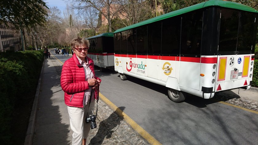 Vi går av bussen i Granada och har fått tips om att åka ett turisttåg upp till Alhambra då det var ganska långt att gå. En plats på kartan fick vi markerat där man kunde gå på tåget. Vi hittar platsen men inget tåg kom. Flera spanjorer väntar också och till slut ringer en av dom och vi förstår att tåget tar en annan väg. Vi följer efter dom och kommer till hållplats nr 11 där vi köper biljetter à 7€ styck och går ombord.