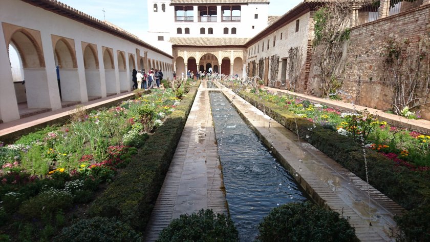 Hela området Alhambra ligger högt med fantastisk utsikt över Granada och är ett världsarv. Alhambra byggdes av Morerna och stod färdigt några år före 1492 då Morerna besegrades av de kristna och fördrevs från Spanien. Mycket turister är i rörelse och området är stort. Fantastiskta trädgårdar med häckar och blommor av många slag.