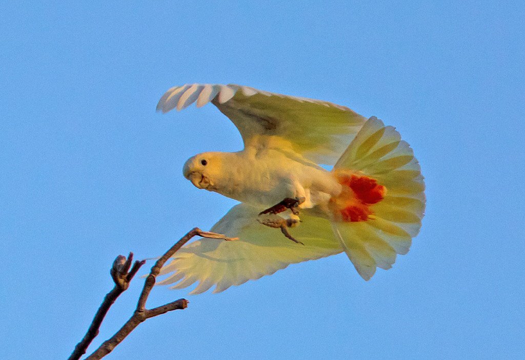 En Filippinkakadua, Cacatua haematuropygia, kommer in för landning