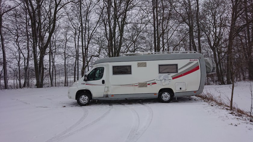 Vi åker en dag tidigare än tänkt då ett snöoväder är på väg in från väster över mellersta och södra Sverige. Vi väljer att köra ner på östsidan via Norrköping och Kalmar. Det är bra väglag förbi Katrineholm, Norrköping och Söderköping. Vi stannar vid rastplatsen i Tindered dit vi kom vid tolvtiden och fikar. Det blev varsin räkmacka och den var inte billig, 119:- styck. När vi fortsätter efter en dryg halvtimme så har det börjat snöa så smått och temperaturen stigit till -3. Det blev lite moddigt på vägen och hastigheten hölls vid 70 km/tim. Vi passerar Kalmar och nu är det nollgradigt och riktigt moddigt på vägen. Vi stannar på ställplatsen vid Brömsebro Fredsstenen.