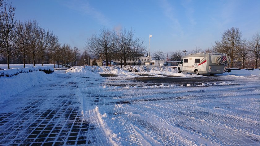 Det är halvklart på morgonen och det klarnar fram på dagen så det blev sol från klar himmel. Följer väg Nr. 1 förbi Hamburg och sedan väg Nr. 7. Det är ju bra motorväg men en grym trafik. Vi stannar vid Serways Lüneburger Hide, Bispinge och fikar samt köper nya vägkartor över Tyskland och Europa. Det går undan på motorvägen men då det är 12 mil kvar blir det plötsligt stopp. 2 mil tar en och enhalvtimma innan det släpper. Vägbyggen var det som stoppade upp. Vi kom fram till ställplatsen i Witzenhausen, Josef-Pott-Platz vid 16-tiden och nu var det mulet med +2 grader.