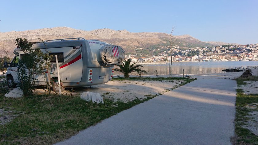 Vid 14:30 är vi framme vid Camping Stobrec utanför Split. Vi tar plats 124 intill stranden.