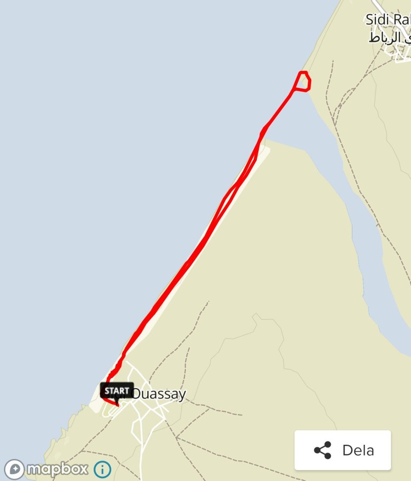 Fortsätter sedan tillbaka till campingen men fortsätter gatan mot Shellmacken där vi tänkte köpa en brödkaka. Cafét var stängt idag så vi fortsatte till Home Café där vi åt lunch för totalt 80 DIR. Ett bageri fanns intill så vi köpte brödkakan och återvänder till campingen. Det blev 5,5 kilometers promenad. Vinden avtar under eftermiddagen och det är +30 grader utanför bilen. Vi tar det lugnt och 18:00 promenrar vi ner till strandpromenaden för att äta födelsedagsmiddag på en restaurang.